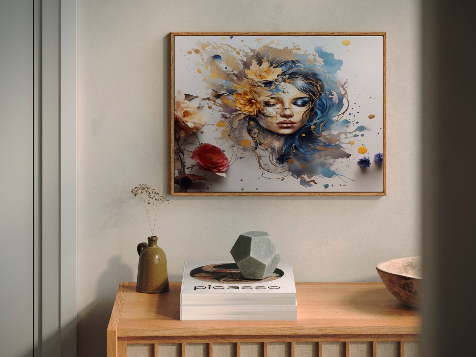 Premium Frames:  Choose from an array of frame colors including Elegant Black, Stunning Gold, Pristine White, and Natural Oak to seamlessly integrate with your decor preferences. Each frame serves as a tasteful accent, complementing the beauty of the curated designs by our favorite artists.
