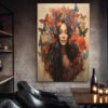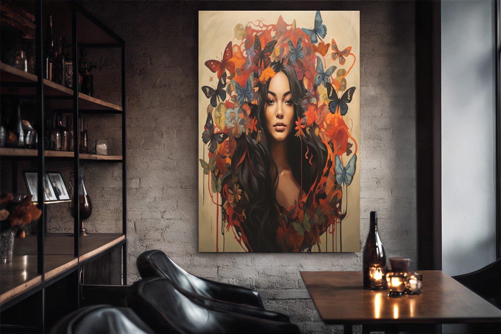 The fusion of feminine beauty and the ethereal presence of butterflies creates a mesmerizing tableau. Each brushstroke unveils the delicate dance between the woman and her winged companions, turning your wall into a canvas of timeless grace. This piece is not merely art; it’s a statement, a celebration of beauty that adds a touch of sophistication to your living space.