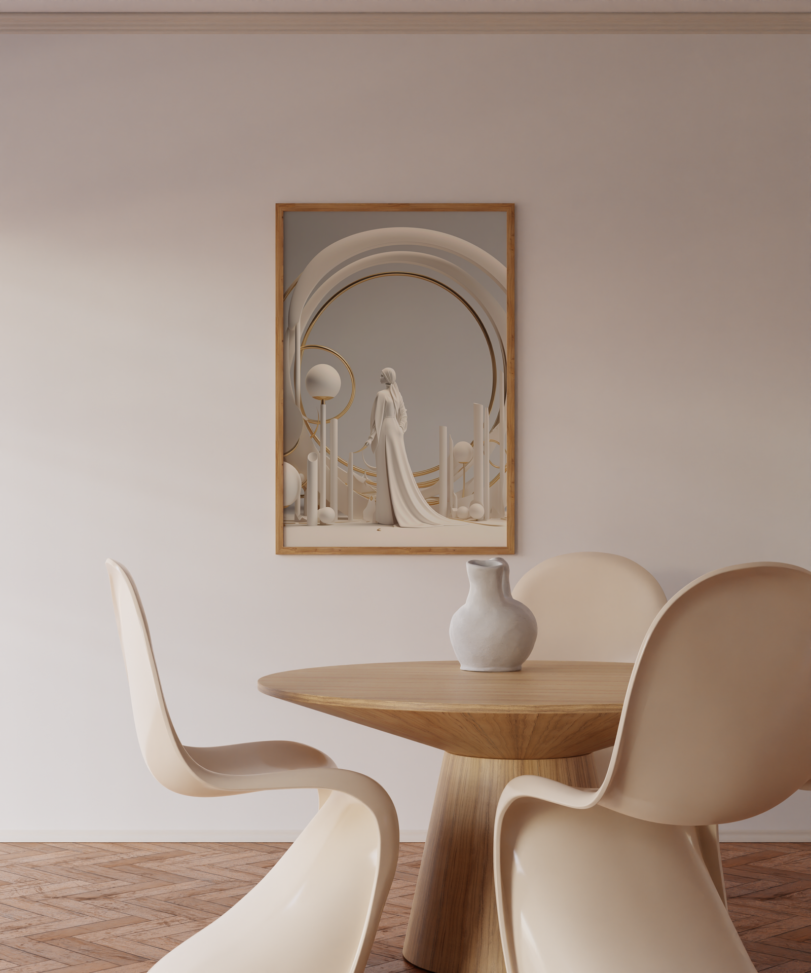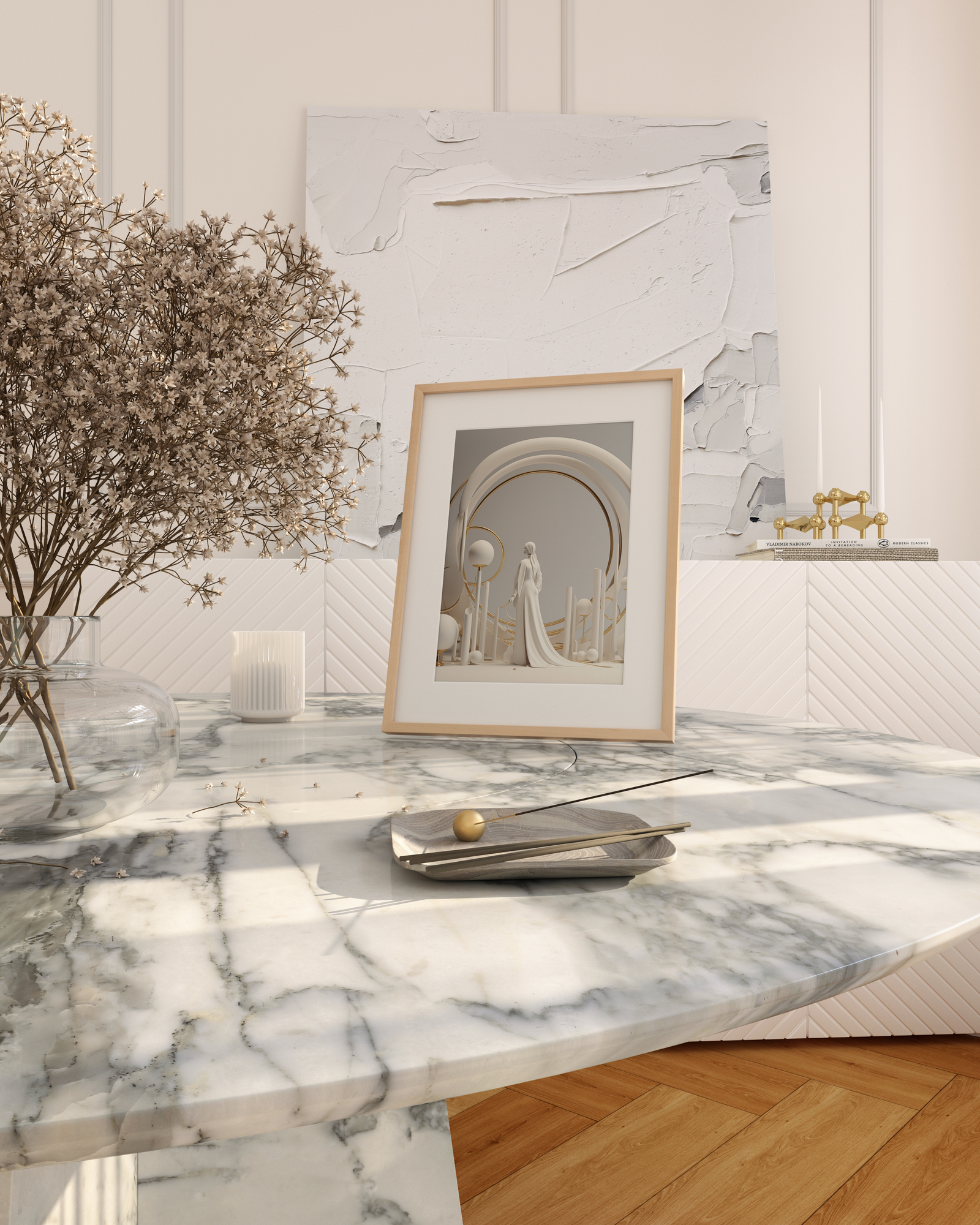 Ivory Muse is our stunning synthesis of grace and solidity. This captivating piece features the ethereal form of a woman sculpted from ivory, surrounded by circles meticulously crafted from stone, creating a visual symphony that blends the delicate and the enduring.