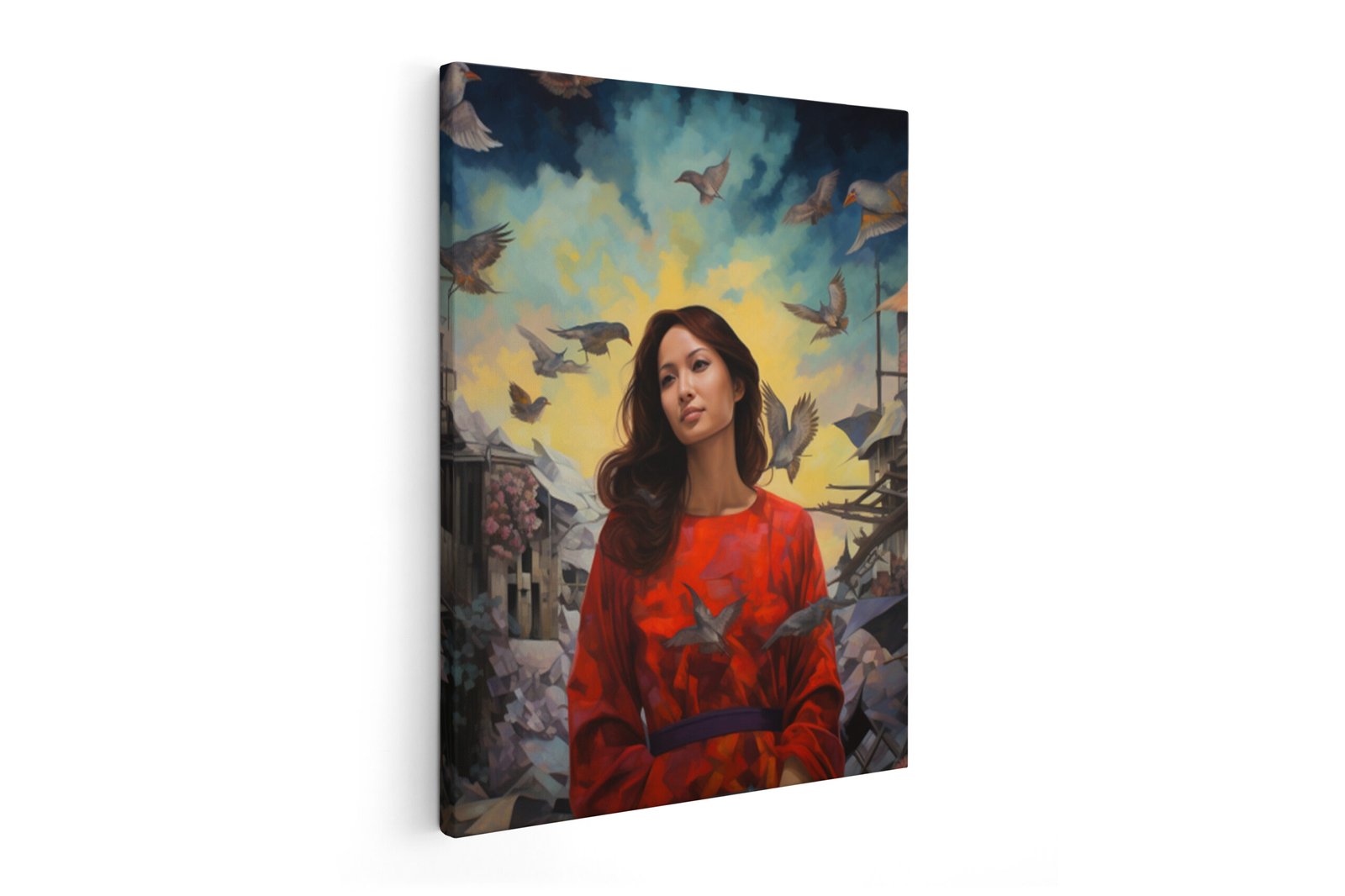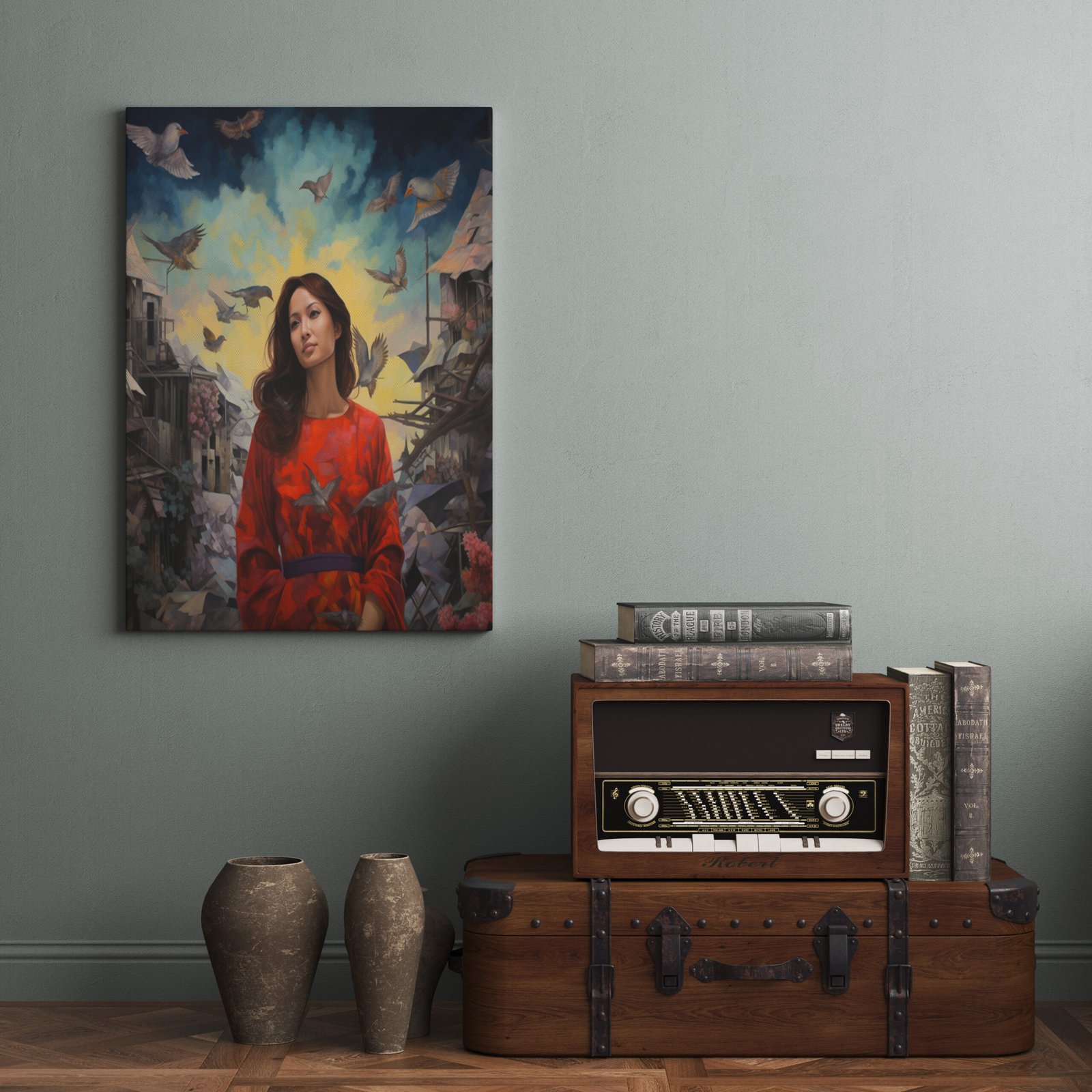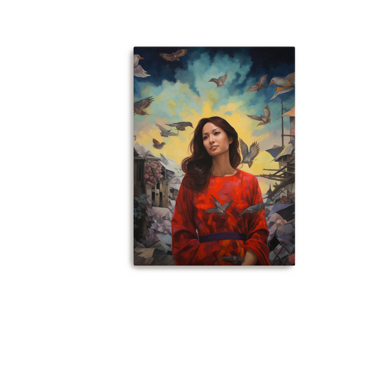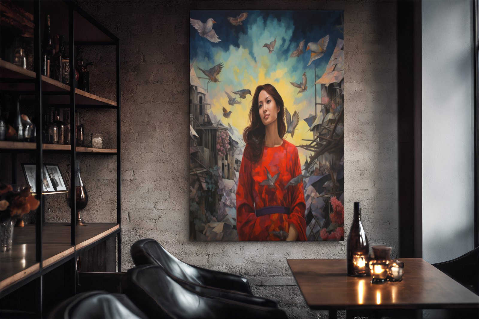 Amidst the rustic village backdrop, the woman engages in a dance of grace with the birds, creating a harmonious tableau that is both enchanting and uplifting. The intricate details invite you to explore the depth and emotion of the artwork, making it a focal point that sparks admiration and adds a touch of sophistication to your living space. Let this piece be the centerpiece of your tranquil haven.