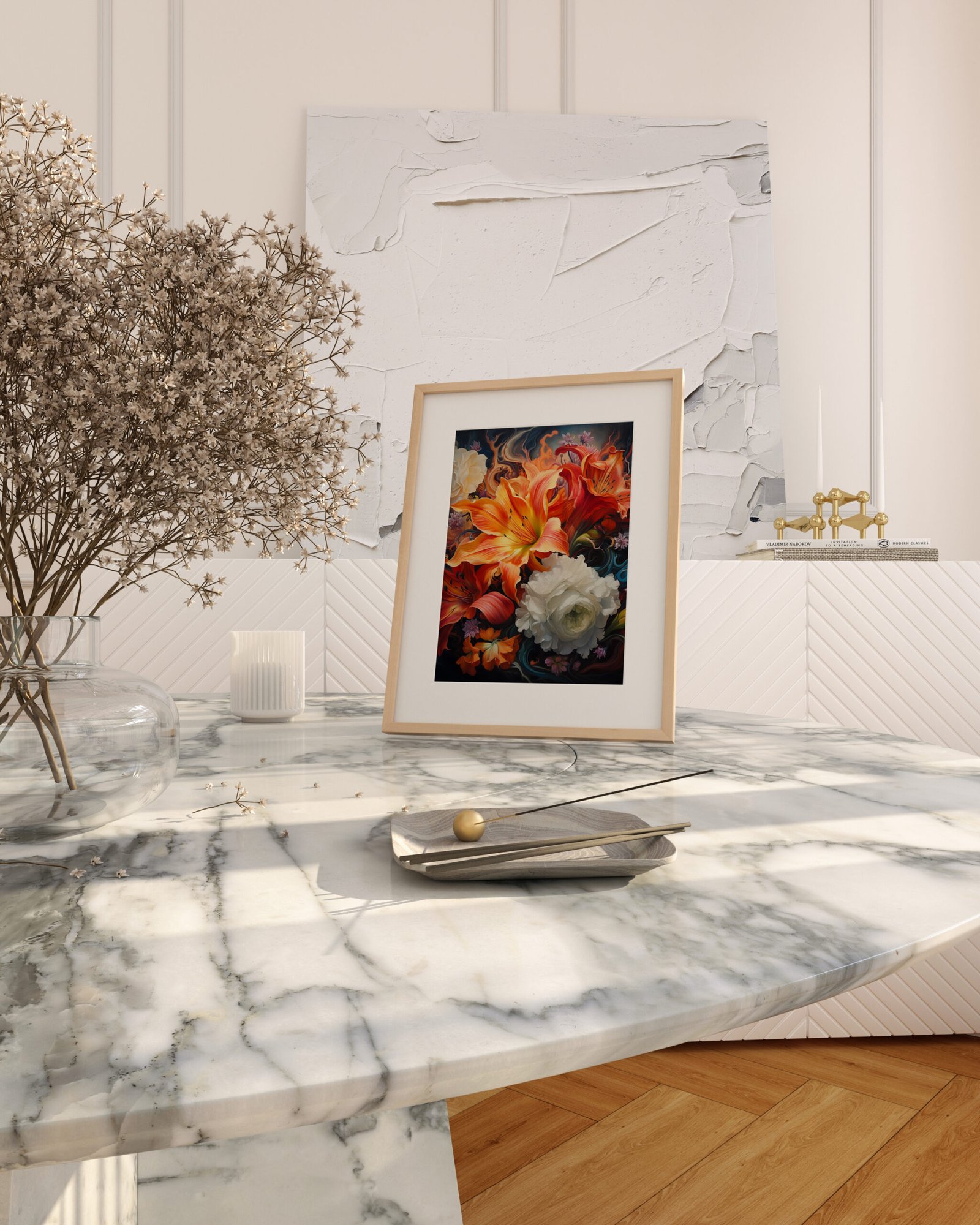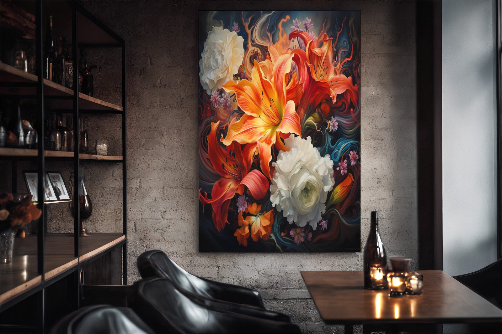 Bask in the beauty of a Radiant Bouquet. Each petal and stem is meticulously captured, creating a visual masterpiece that exudes elegance and opulence. This piece turns your walls into a canvas of floral sophistication.