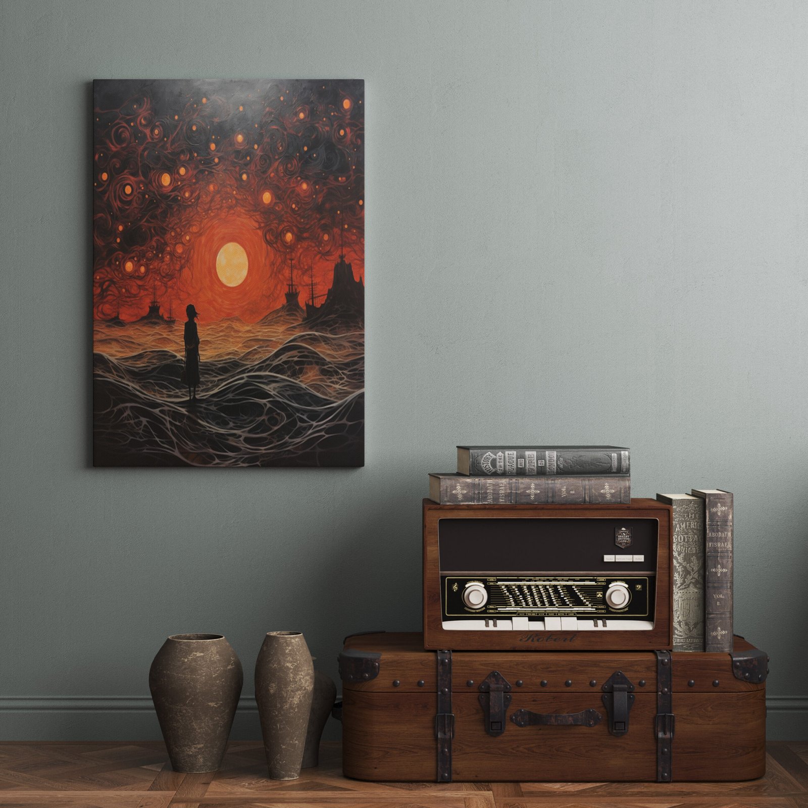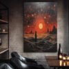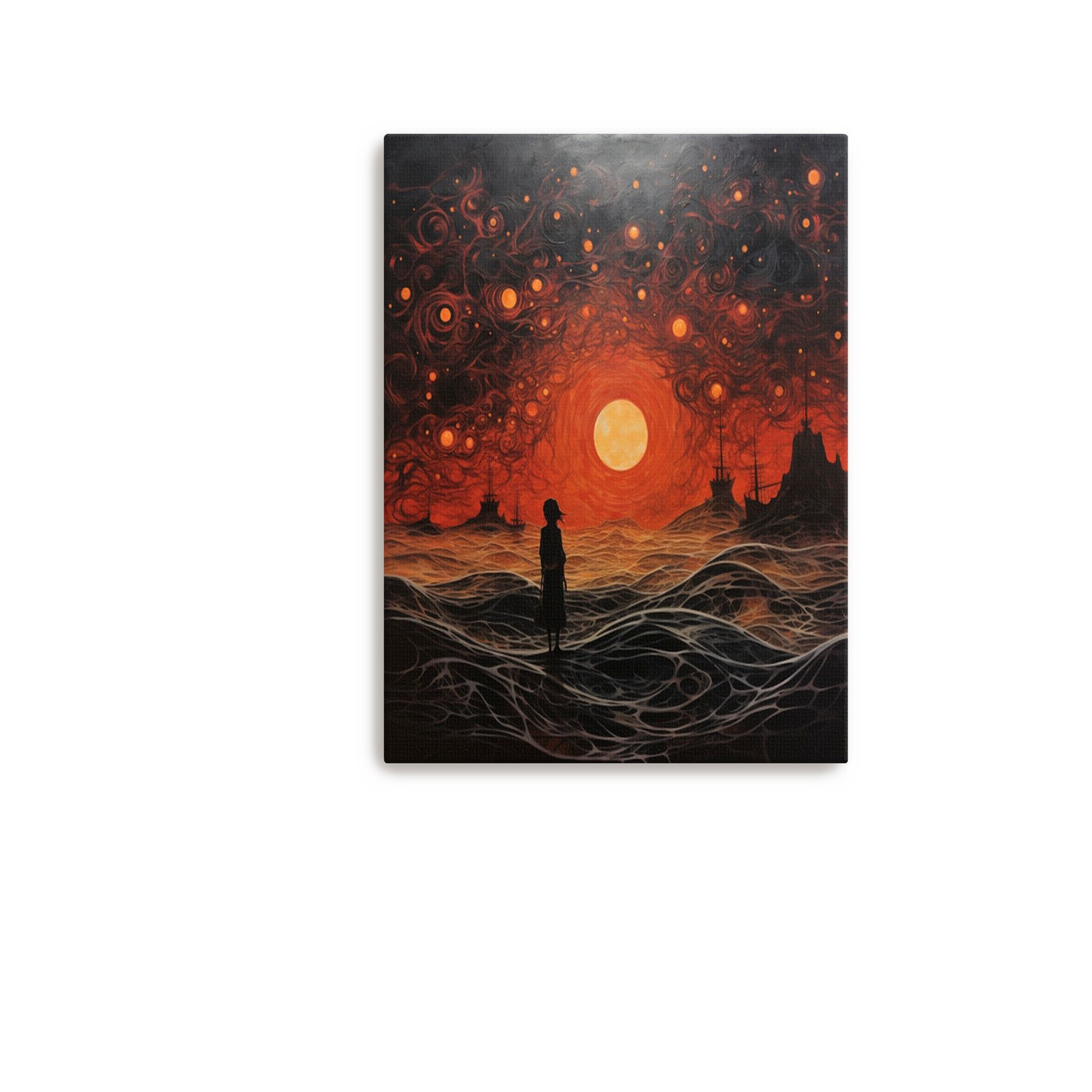 The crimson waves serve as a dramatic canvas for the graceful silhouette of the woman, creating a striking contrast that is both powerful and alluring. The intricate details invite you to explore the depth and emotion of the artwork, making it a focal point that sparks contemplation and adds a touch of sophistication to your living space. Let this piece be the heartbeat of your passionate sanctuary.